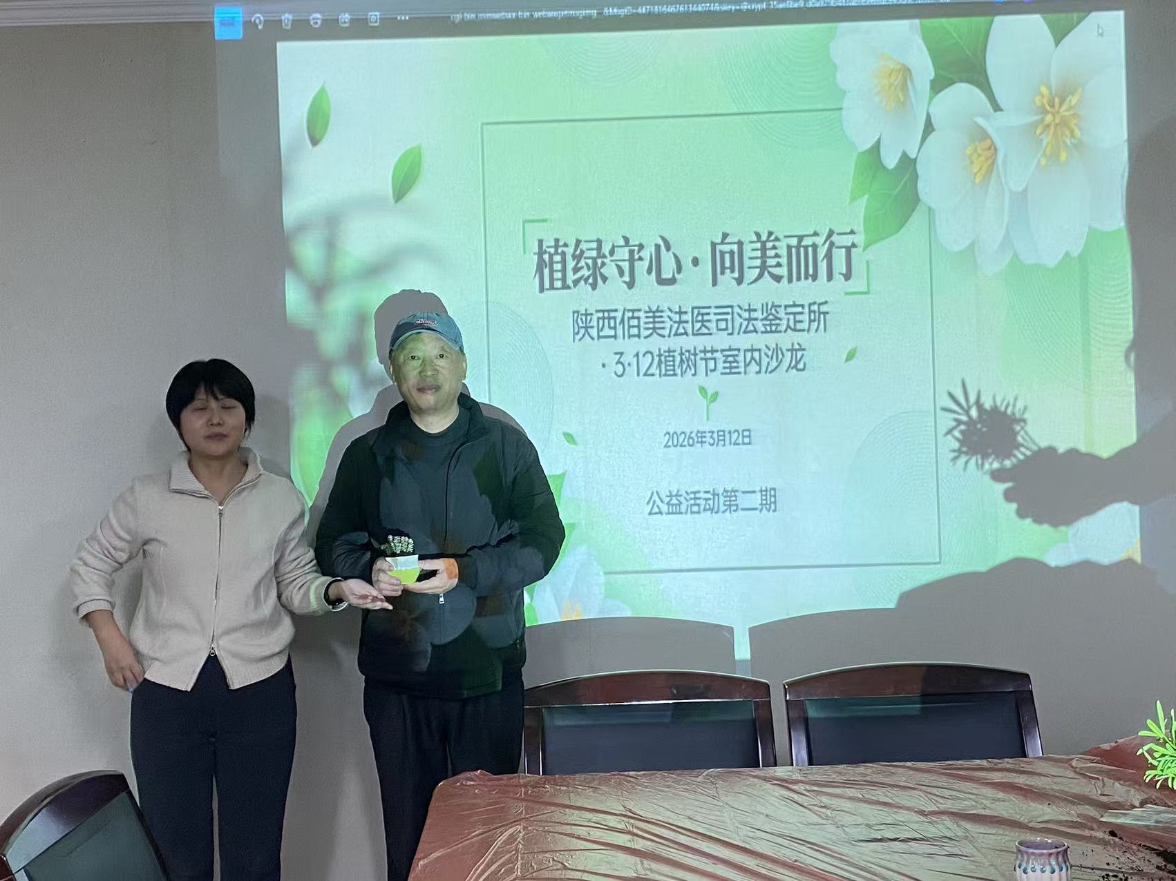活动现场,投影幕布上的春日绿意与“植绿守心·向美而行”的主题交相辉映,营造出温馨盎然的氛围。参与活动的人员齐聚一堂,不仅共同探讨了司法鉴定行业的责任与使命,更通过盆栽赠予等互动环节,传递着对委托方的感恩与对绿色发展的追求。手中的小小盆栽,既是春日的美好象征,也是佰美法医鉴定所秉持专业初心、守护公平正义,同时践行社会责任的生动体现。